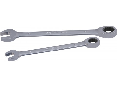 Гаечный ключ с накидной рабочей частью со встроенным храповым механизмом. Поставляется в комбинации с рожковой частью того же размера. Ключ применяется при обслуживании крепежа при свободном его вращении, без экстремальных нагрузок. Малый, 5°, обратный ход делает ключ незаменимым в ограниченном рабочем пространстве. Храповой механизм “SNAP GEAR”, с колесом в 72 зуба, обеспечивает достаточно высокий передаваемый крутящий момент благодаря закаленной особым способом хромованадиевой стали, применяемой при производстве механизма. Ключ изготовлен по стандарту ANSI, имеет трехслойное хромоникелевое покрытие, зеркально отполирован.