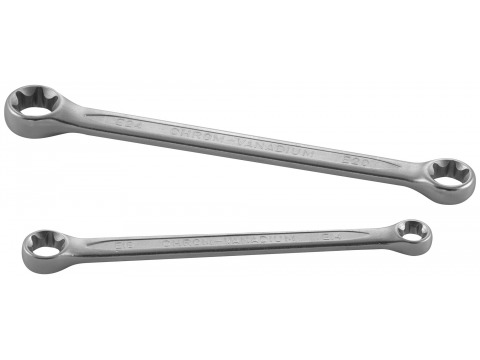 Ключ с кольцевой рабочей частью. Применяется для обслуживания резьбовых крепежных элементов, снабженных головками, имеющими рабочий профиль E-TORX®. Изготовлен из хромо-ванадиевой стали, закален, имеет хромоникелевое покрытие.