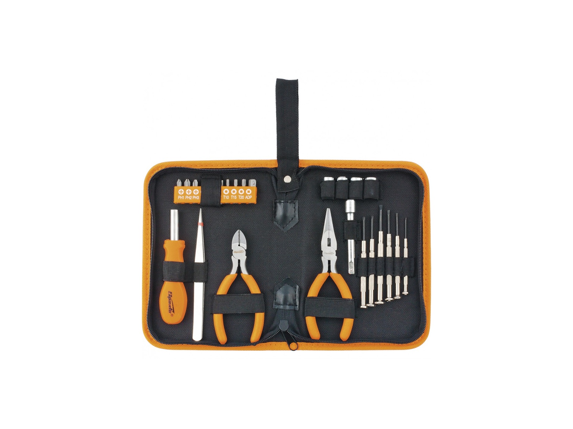 Набор инструментов из 25 предметов. В комплект входят длинногубцы, бокорезы, отвертка, переходник, пинцет, удлинитель, шесть часовых отверток, торцевые головки 7, 8, 9, 10 мм и биты PH 1, PH 2, PH 3, SL 4, SL 6, SL 7, T 10, T 15, T 20.
