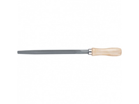 Напильник предназначен для качественной обработки плоских поверхностей и трехгранных отверстий в твердых материалах. Инструмент имеет двойную перекрестную насечку №2. Площадь сечения напильника уменьшается от середины к носу. Напильник изготовлен из углеродистой стали. Поставляется в комплекте с деревянной рукояткой, которая покрыта бесцветным лаком, защищающим древесину от рассыхания и набухания.