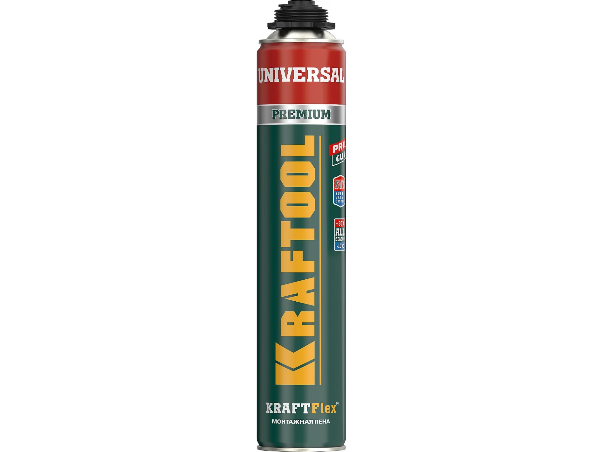PROFESSIONAL. Включает специальные добавки улучшающие качество пены. "SVS" Super Valve System инновационное запатентованное устройство клапана позволяет хранить баллон в любом положении (не только в вертикальном). ALL-SEASON всесезонная пена: можно применять в любое время года. Увеличенный срок годности. Полное затвердевание около 12 часов* Высокие термо- и звукоизолирующие свойства. Превосходная адгезия к основным строительным материалам (кроме силикона, полиэтилена и полипропилена). После выхода пена расширяется в 1,5-2 раза чем достигается значительная экономия материала. В затвердевшем виде не огнеопасна и не токсична