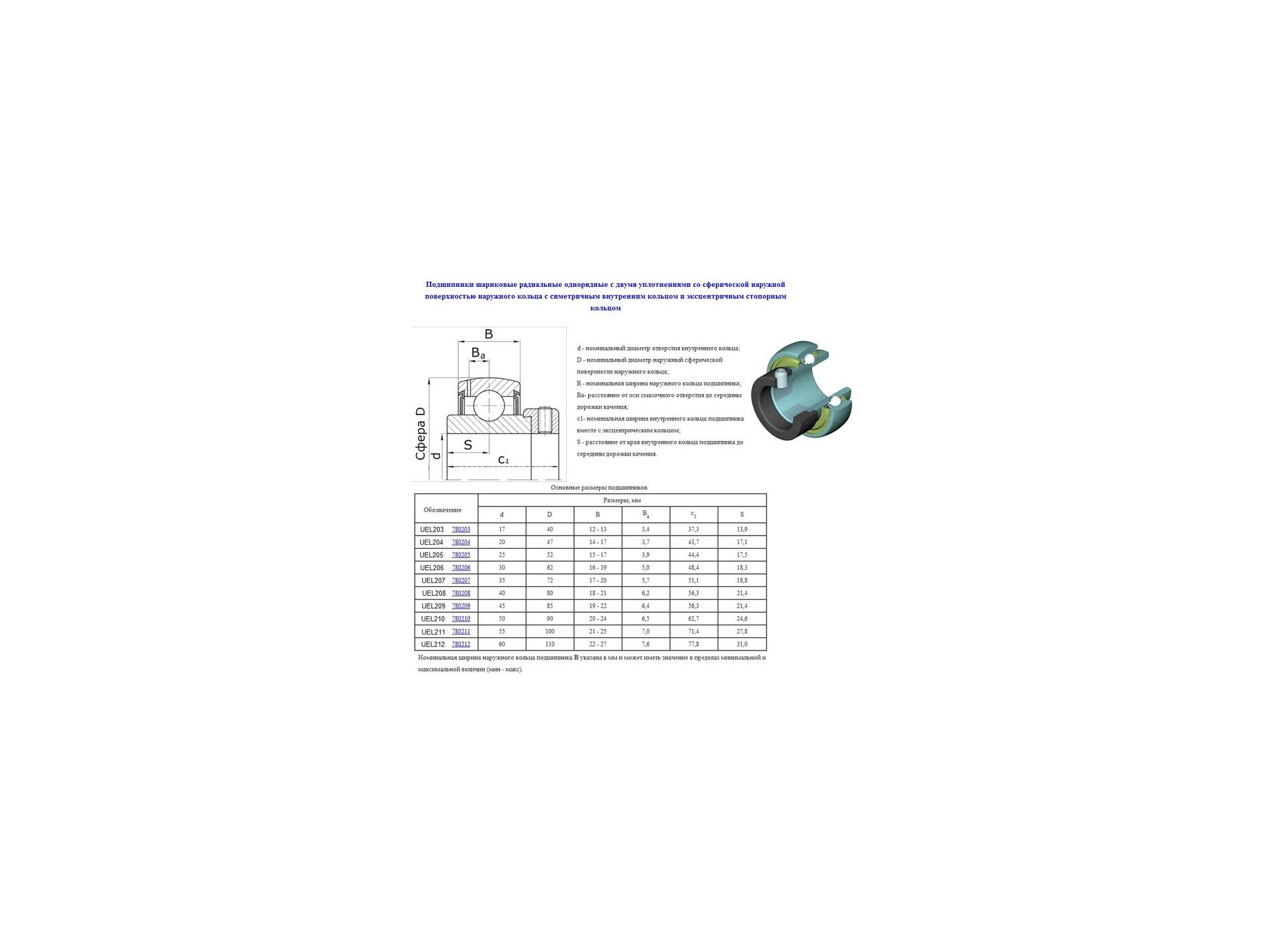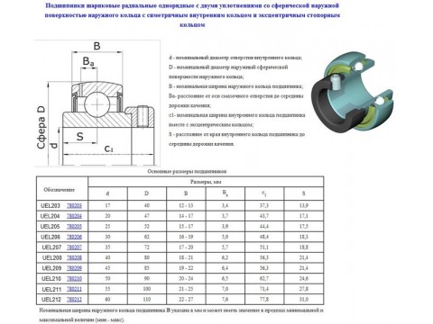 Подшипники шариковые радиальные однорядные с двумя уплотнениями со сферической наружной поверхностью наружного кольца с симетричным внутренним кольцом и эксцентричным стопорным кольцом.