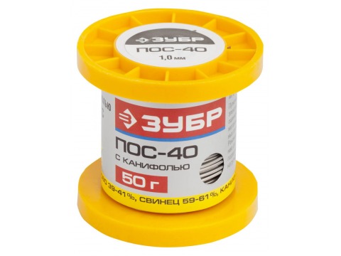 Припой ПОС 40 Зубр 55451-050-10C применяется для пайки элементов электроаппаратуры: диодов, транзисторов, конденсаторов, микросхем и др., также припой может использоваться для пайки деталей из оцинкованного железа с герметичными швами, медных проводов и латуни, соединения элементов, подверженных вибрационным нагрузкам. Припой с 40% содержанием олова и 60% содержанием свинца оптимально подходит в случаях, когда элементы для спайки нельзя перегревать. Продукция предназначена для профессионального использования. Припой имеет высший уровень качества и прошёл спектральную и химическую проверку. Соответствует ГОСТ 21931-76.