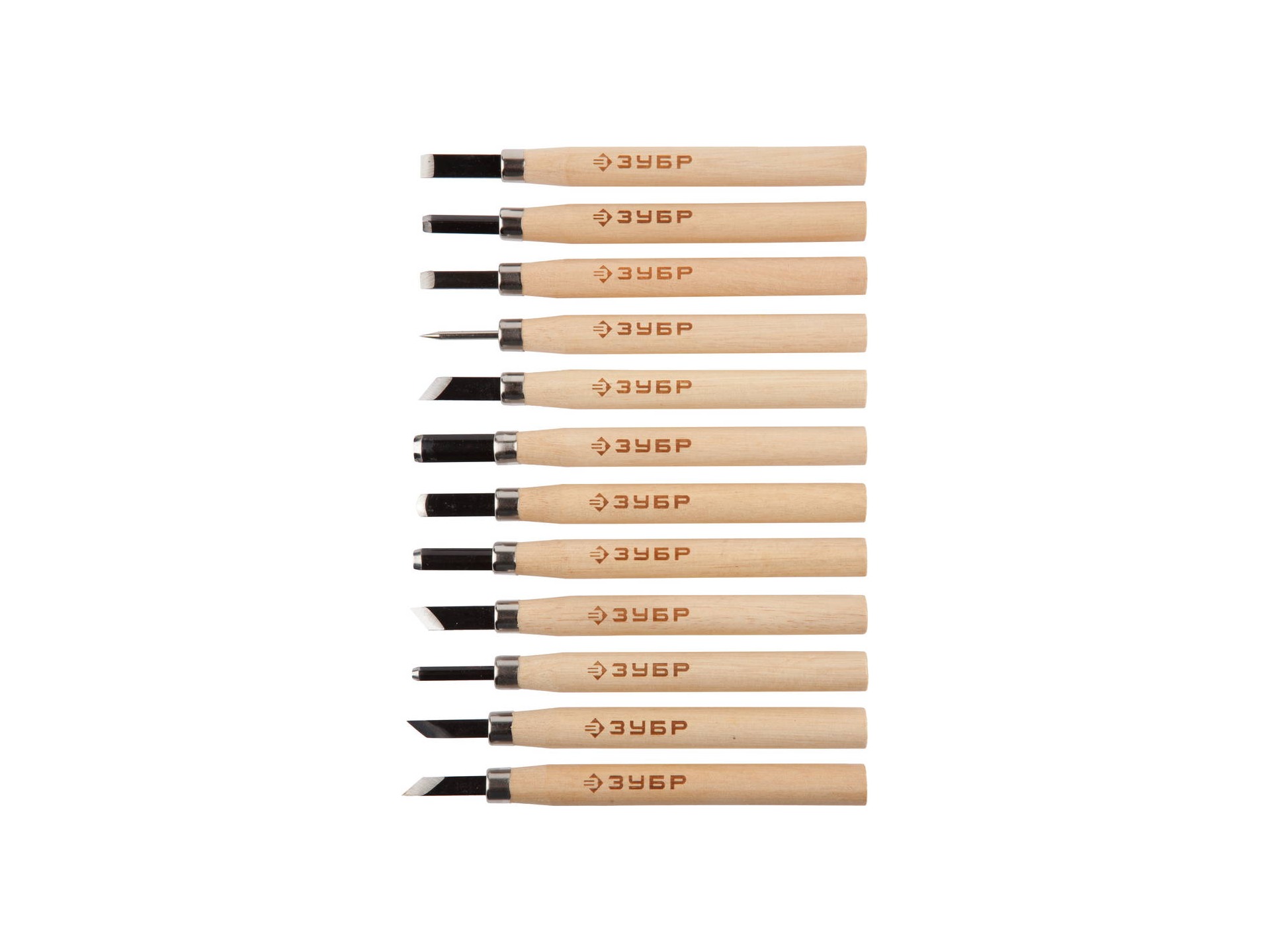 Комплектация косой резец, 11мм; прямой резец, 12мм; полукруглый резец, 6мм; изогнутый V-резец 45◦; изогнутый полукруглый резец, 6мм; изогнутый прямой резец, 12мм.